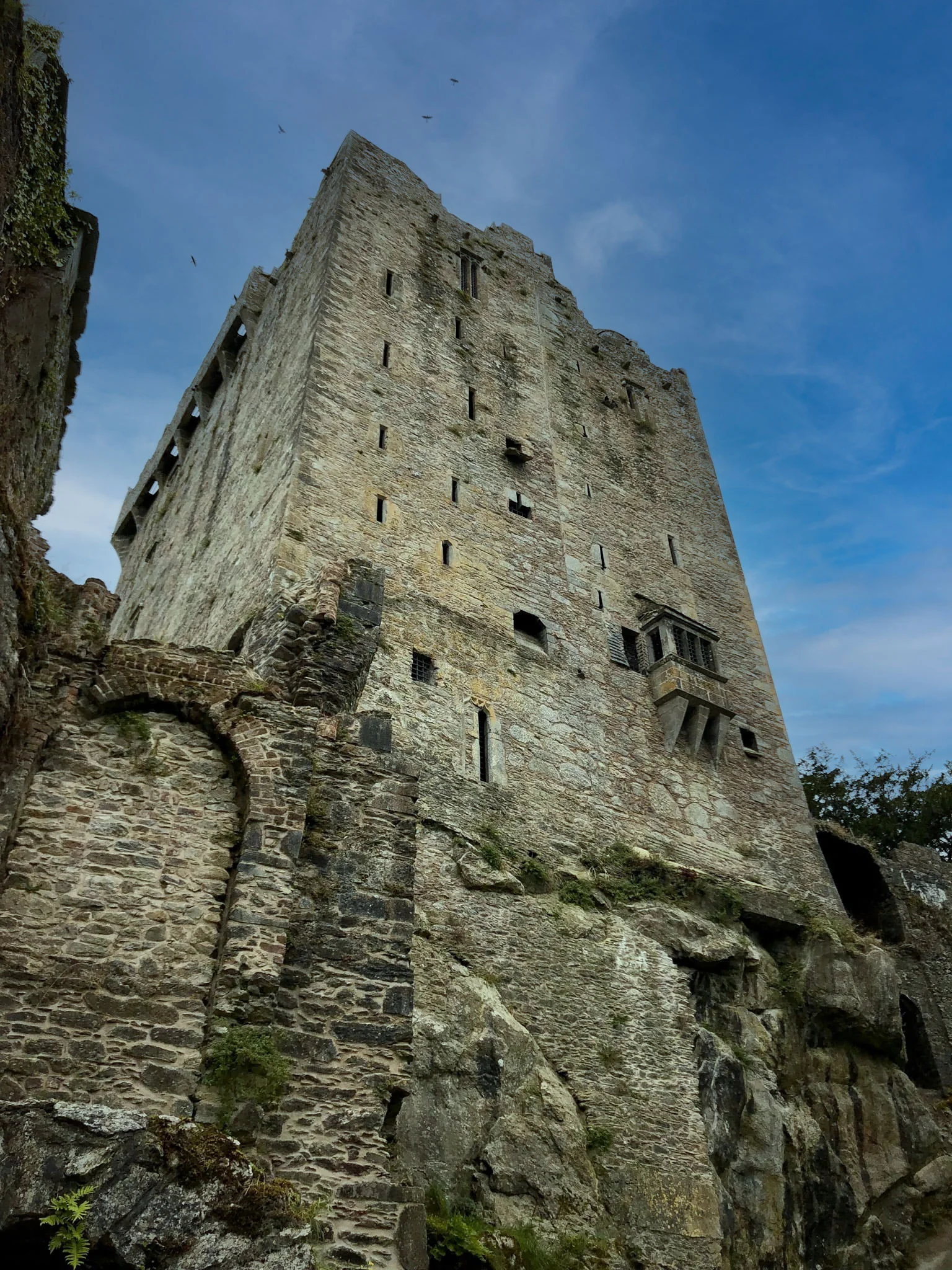 Blarney Castle sits directly on an eight-meter cliff of rock and has a dramatic look because the walls slope gradually inwards. The seam you can see on the right-hand side of the wall shows that the Castle was built in two stages. There are also three large square holes in the wall, left for the garderobes, aka indoor lavatories, which were state-of-the-art features for the time.