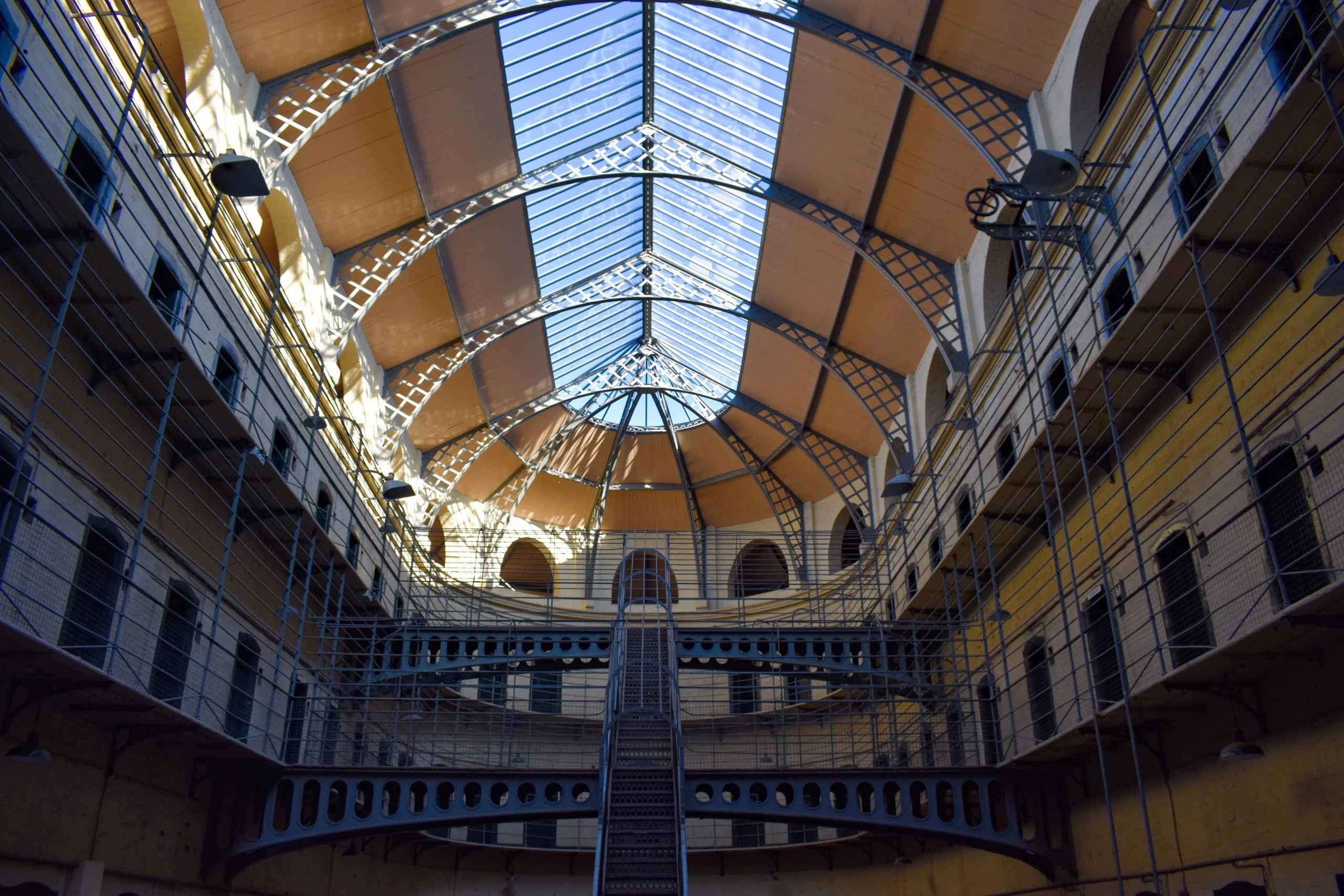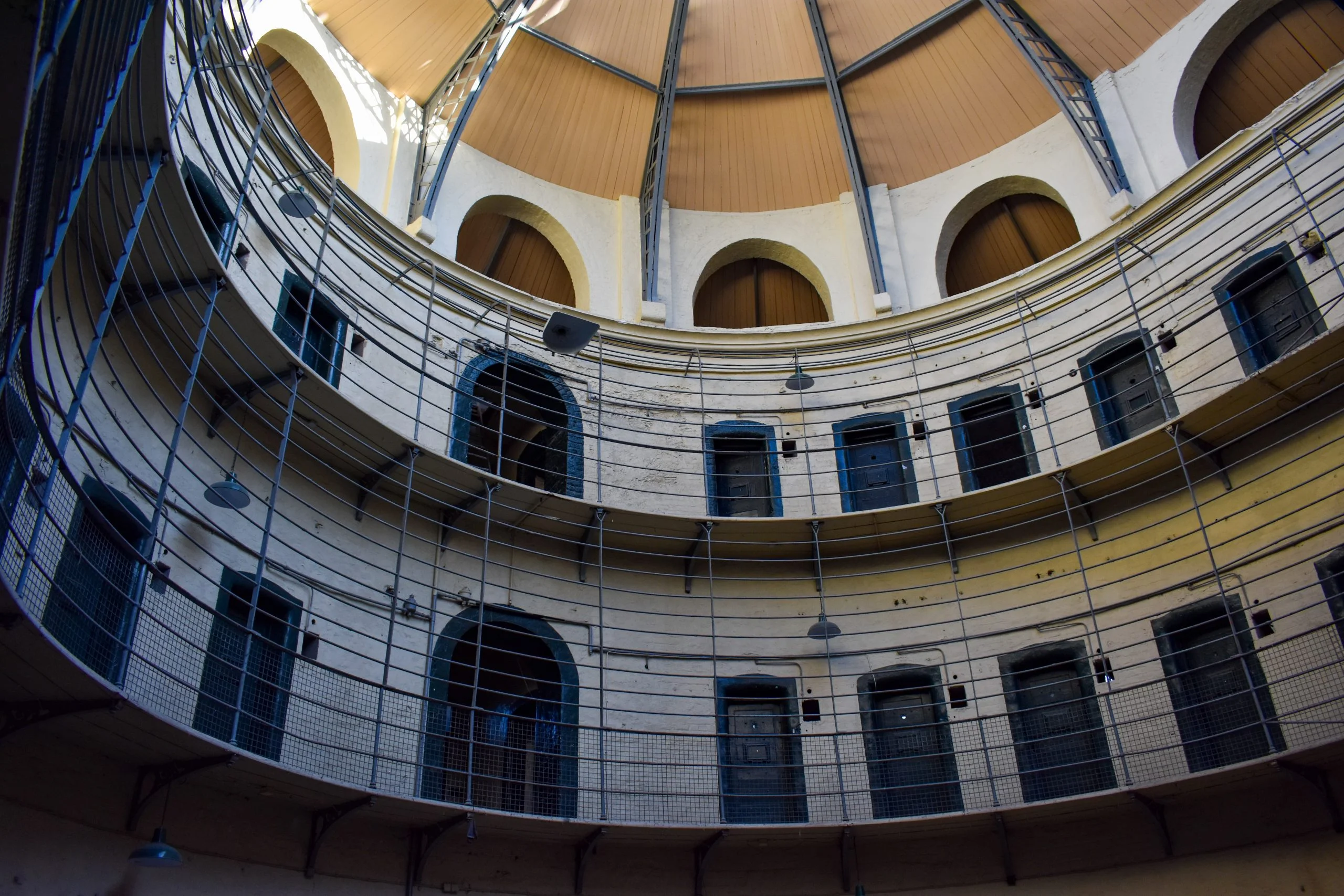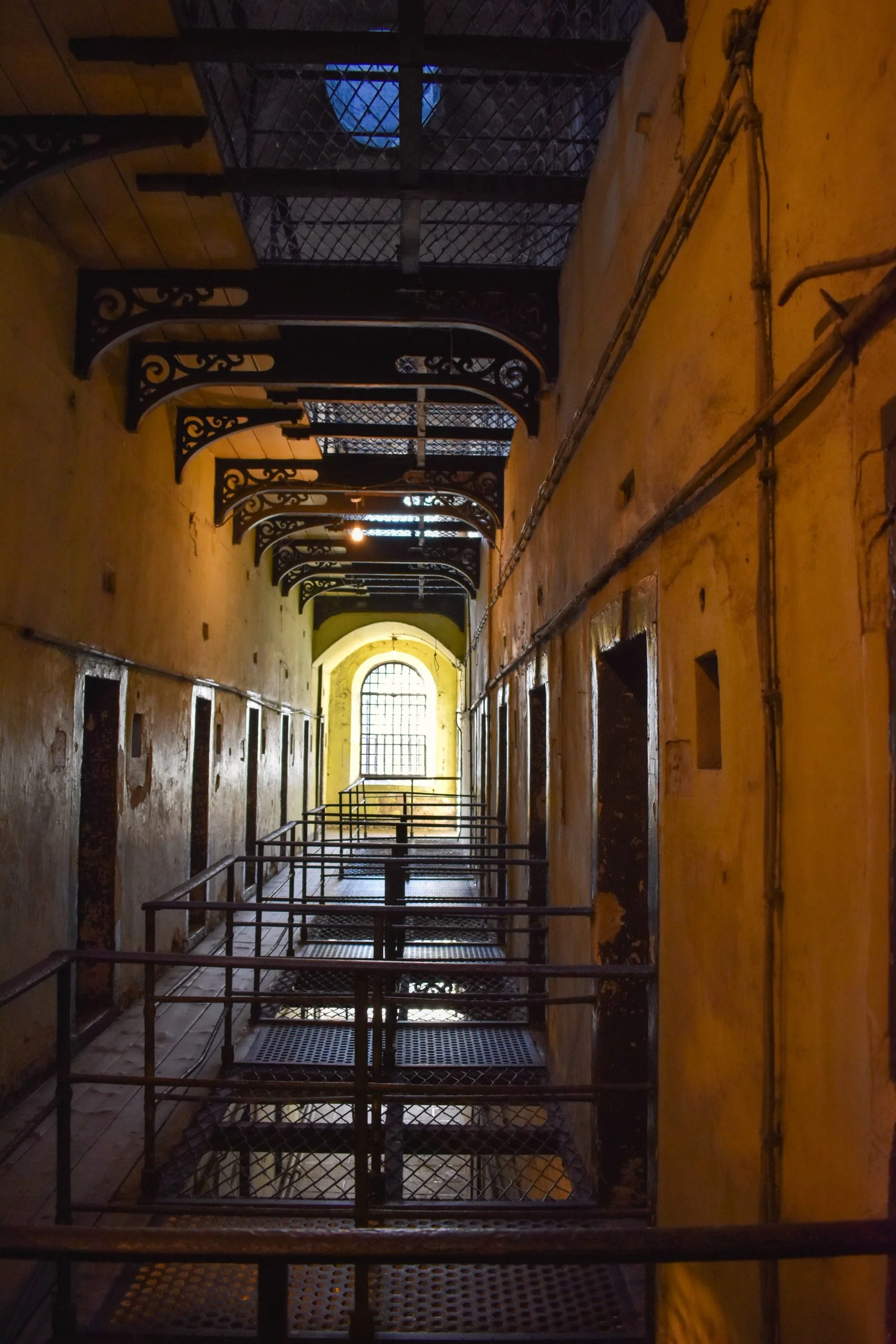 Kilmainham Gaol replaced an earlier prison that was located nearby in response to overcrowding in the 18th century. Construction began on the “New Gaol” in 1786 which was designed by John Trail and cost the Grand Jury of the County of Dublin a total of £22,000. This new site sat higher on the hill, which allowed for better drainage, thus allowing fresher air to circulate through the Gaol. The original gaol was dark and unforgiving, with toilet facilities being pots inside cells, and light and warmth only coming from candles. The Prison Reform Movement, led by John Howard, protested the typical atmosphere of gaols and pushed for single cells and facilities for hygiene and health. This change was exemplified in the late 1850s when the East Wing was replaced on the New Gaol. Architect John McCurdy, a freemason and college architect of Trinity College of Dublin, won the advertised design competition, and four years later, the Victorian age ideology of prison architecture being crucial to inmate reform, was showcased. The East Wing illustrated the panopticon concept, with all 96 cells viewable from a central observation area.